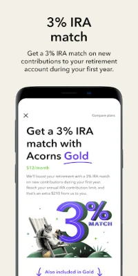 - 3% IRA match on new contributions to your Acorns Later retirement account during your first year with Acorns Gold
