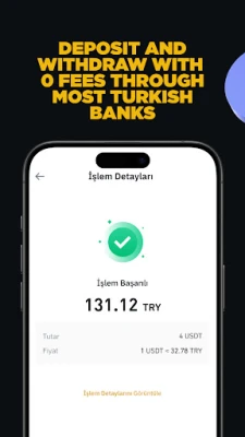 You can deposit and withdraw Turkish Lira free of charge by transferring 24/7 from your Ziraat Bank, Vakıfbank, Akbank, Fibabanka, Türkiye İş Bank, Şekerbank and Türkiye Finans Participation Bank accounts.