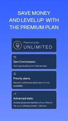 Once you become a Premium member, you can enjoy an unlimited experience. Save money on every transaction and avoid additional court booking fees. Moreover, you'll receive personalized priority alerts. You'll have the ability to choose which notifications you'd like to receive based on your preferences, so you can stay updated on matches, court availability, and last-minute opportunities. Your time is valuable, and it's valuable to us too!