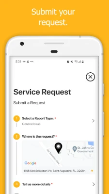 SJC Connect is a free resource for residents of St. Johns County, Florida, that enables them to report issues from their mobile devices. Requests are sent directly to St. Johns County staff for processing and review. A tracking number is provided for each service request, and notifications are sent when the status of the request is updated.